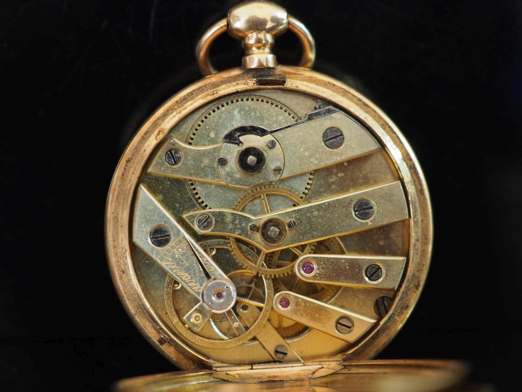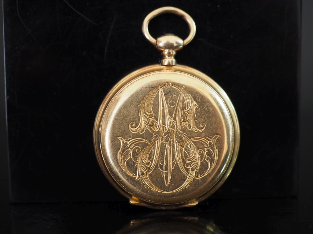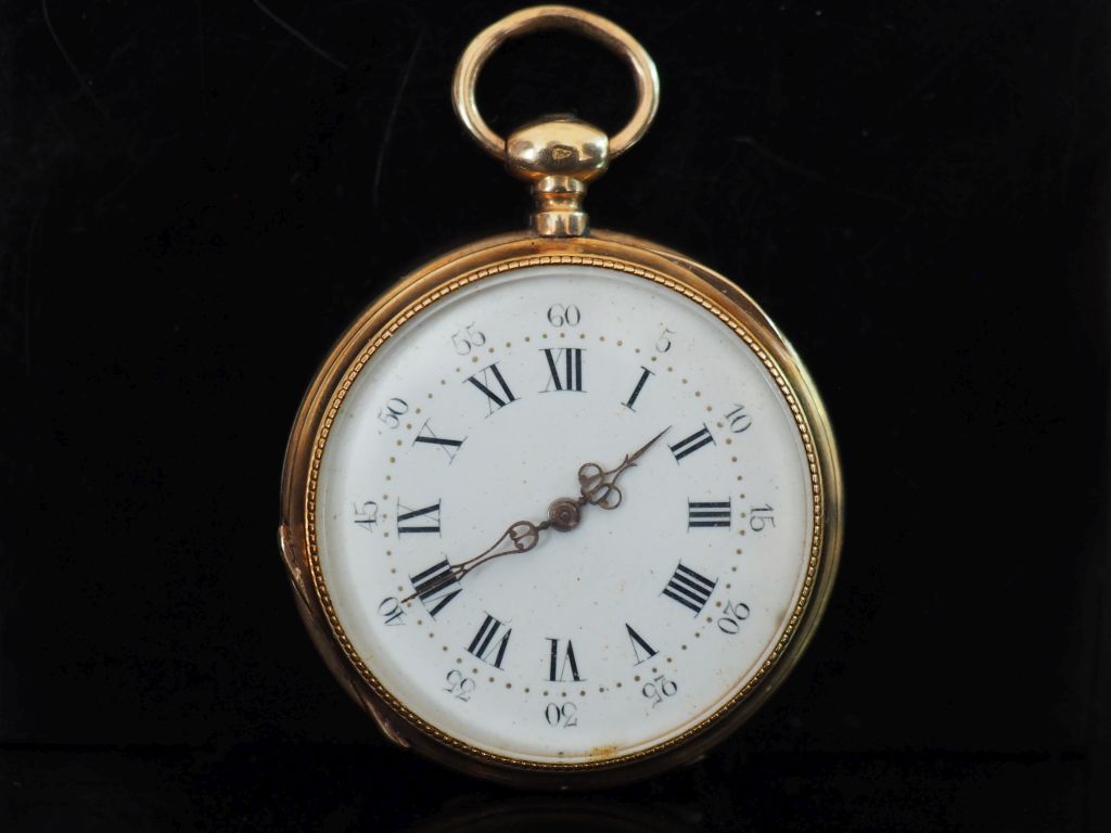 Montre de col Napoléon III en or jaune 750. Cadran à chiffres romains pour les heures et arabes pour les minutes. Le revers, à décor de monogramme feuillagé. Double fonds en or jaune 750. Diam. 35 mm Poids tel. 31,50 g