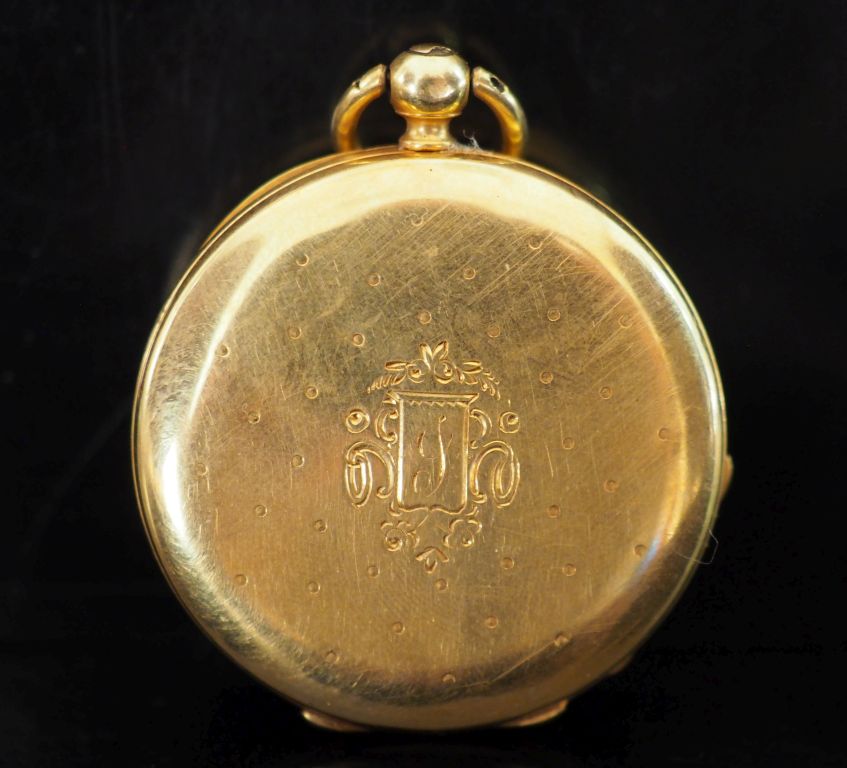 Montre de col Napoléon III en or jaune 750. Cadran rond à chiffres romains pour les heures, chemin de fer pour les minutes. Le revers, à décor d'armoiries sur fond de semi de pois. Diam. 33 mm Poids tel. 22,87 g