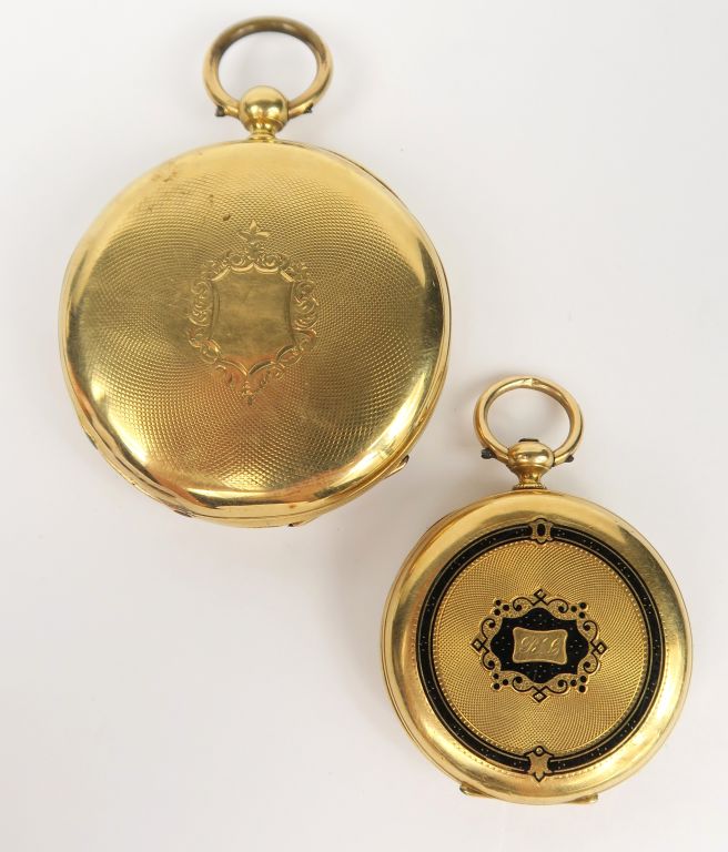 Montre de gousset, cadran accidenté, et montre de col en or émaillé. Poids tel : 79,7 g