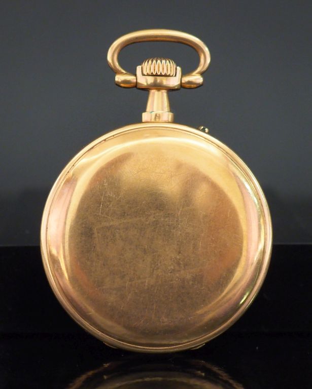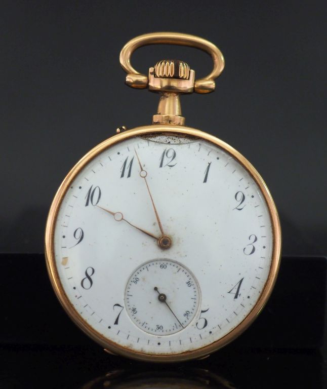 Montre de gousset en or jaune 750. Cadran à chiffres arabes pour les heures et index bâtons pour les minutes. Compteurs pour les secondes à 6h. Double fonds en or jaune. Diam. 48 mm Poids tel. 99,45 g (verre accidenté)