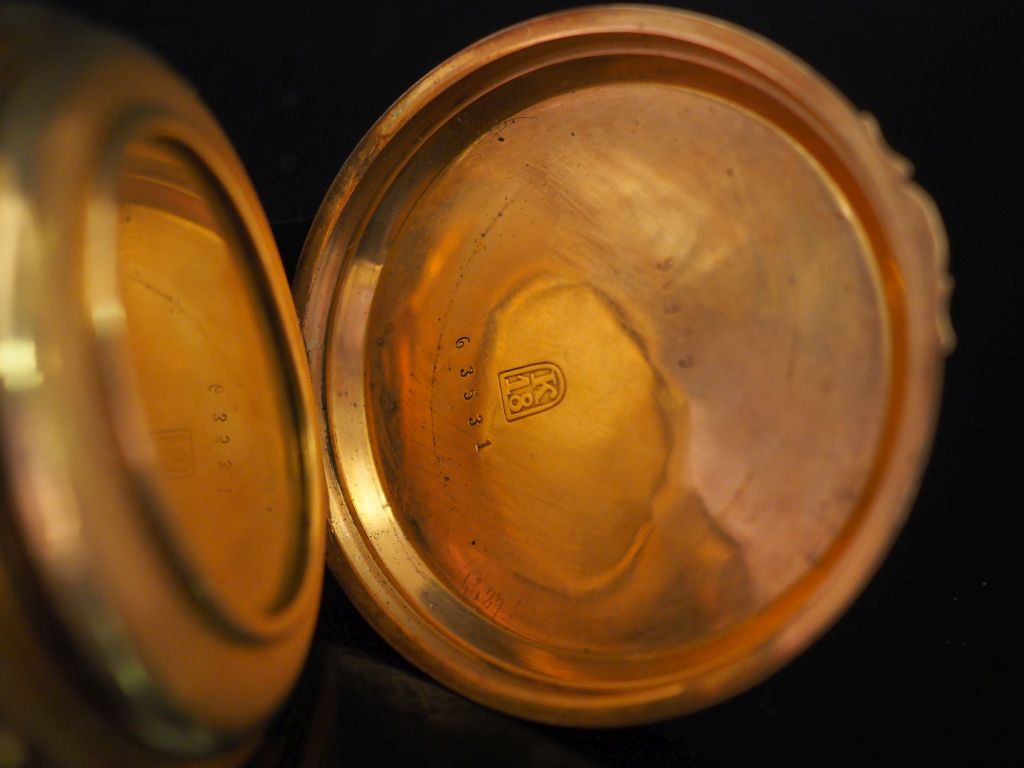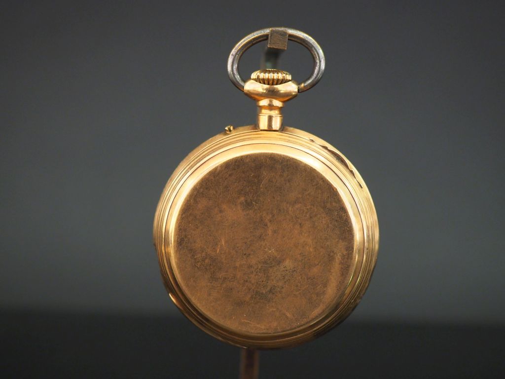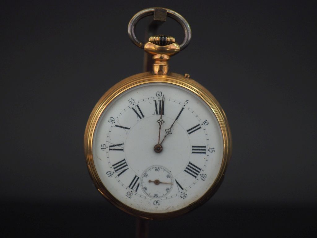 Montre de gousset en or jaune 750. Cadran à chiffres romains pour les heures et arabes pour les minutes. Compteur pour les secondes à 6h. Double fonds en or jaune 750. Diam. 48 mm Poids tel. 81,18 g (bélière en métal)