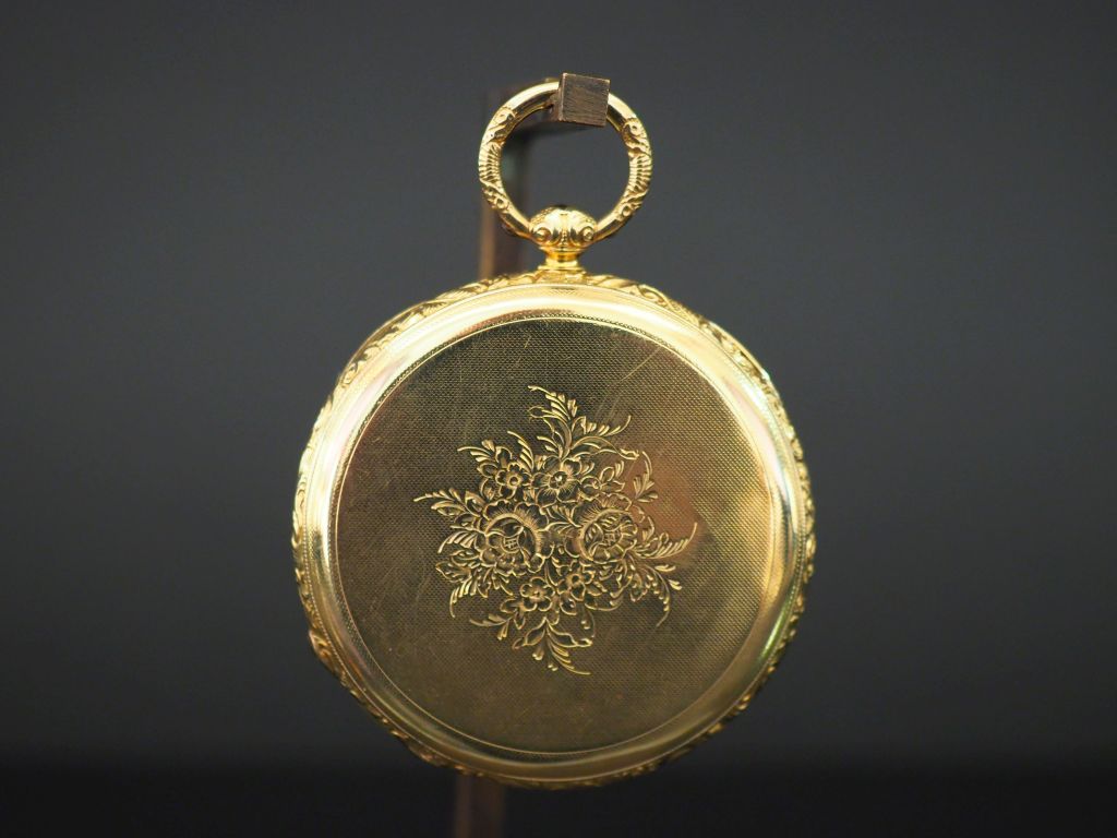 Montre de gousset en or jaune. Cadran à chiffres romains pour les heures. Le portour, à décor de rinceaux feuillagés. Le revers, à décor d'un bouquet de fleurs. Double fonds en or. Diam. 44 mm Poids tel. 46,58