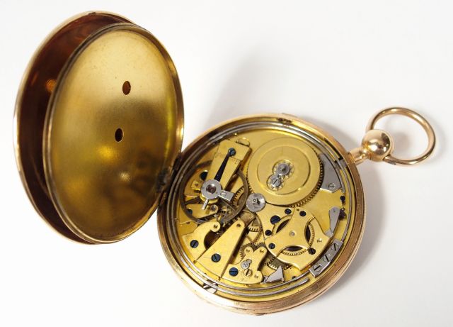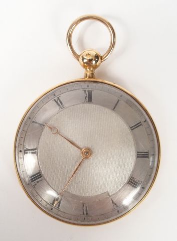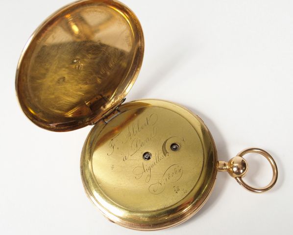 Montre de gousset en or jaune, cadran acier, chiffres romains. Diam. : 54mm Poids tel: 94,4gr