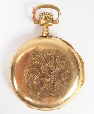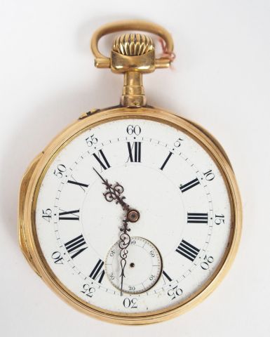 Montre de gousset en or jaune, cadran émail, chiffres romains, trotteuse (manque aiguilles), décor de monogramme (manque verre, en l'état). Diam. : 50mm Poids tel: 92,8gr