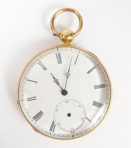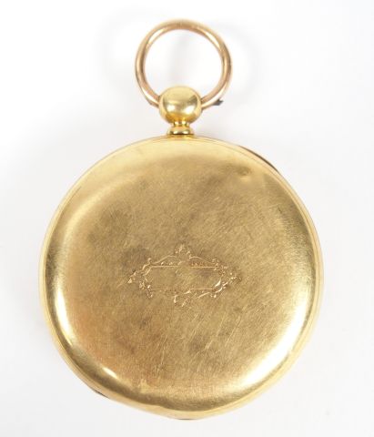 Montre de gousset en or jaune, cadran émail, chiffres romains, trotteuse, décor de blason. Diam. : 45mm Poids tel: 65,2gr