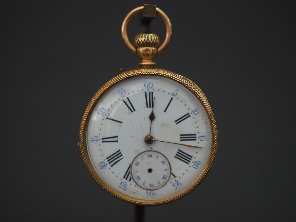 Montre de gousset en or jaune. Cadran émaillé à chiffres romains pour les heures et arabes pour les minutes. Compteur pour les secondes à six heures. Le revers, à décor de cartouche. Diam. 45 mm Poids tel. (sans le verre) : 68,50 g (verre à refixer, manque une aiguille, petits cheveux au cadran)