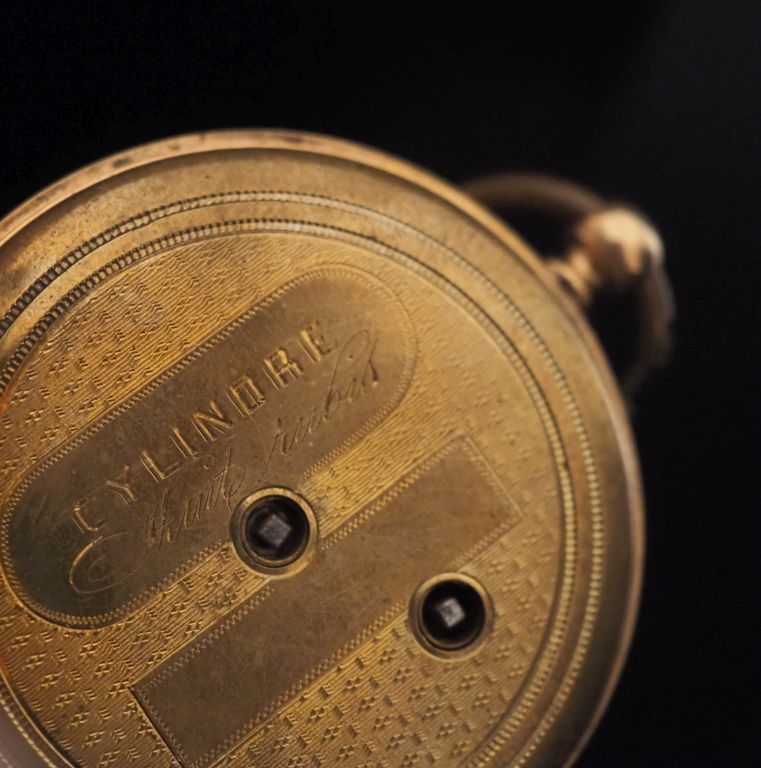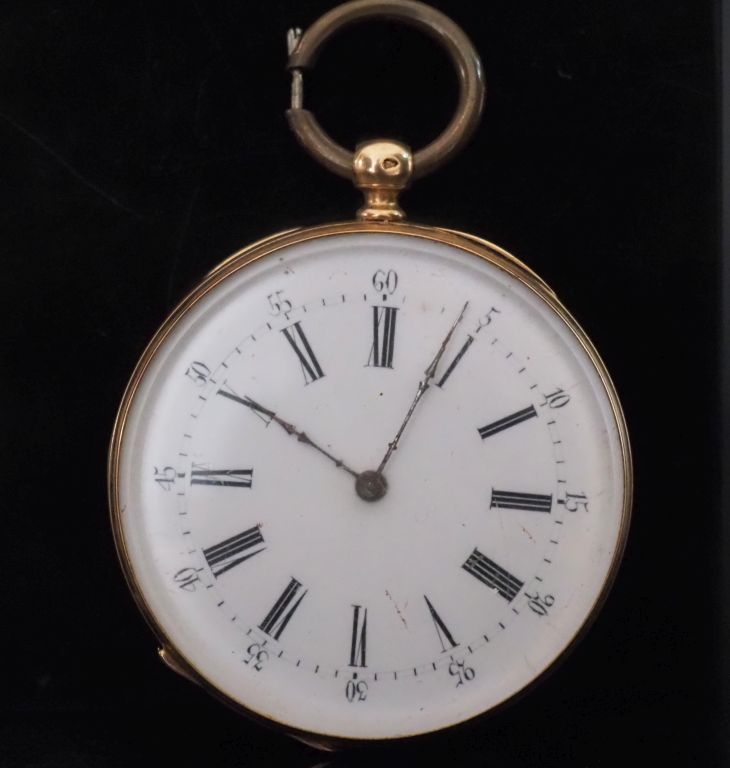 Montre de gousset Napoléon III en or jaune 750. Cadran à chiffres arabes pour les heures et arabes pour les minutes. Le revers, à décor de guirlandes de feuillages et de fleurs, rinceaux et cartouche. Double fonds et bélière en métal. Diam. 45 mm Poids tel. 54,65 g (petites traces de soudure anciennes)