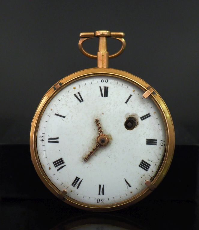 Montre de gousset XIXème en or jaune 750. Cadran émaillé à chiffres romains pour les heures. Diam. 50 mm Poids tel. 71,97 g (cadran et aiguilles accidentés, manque le verre)