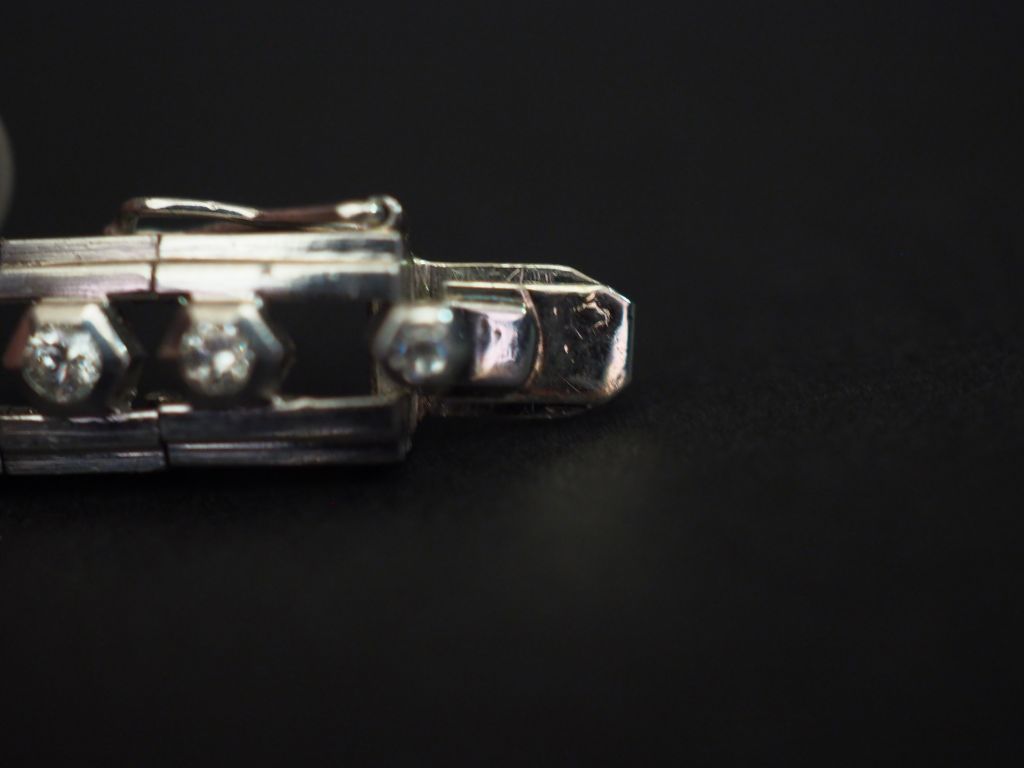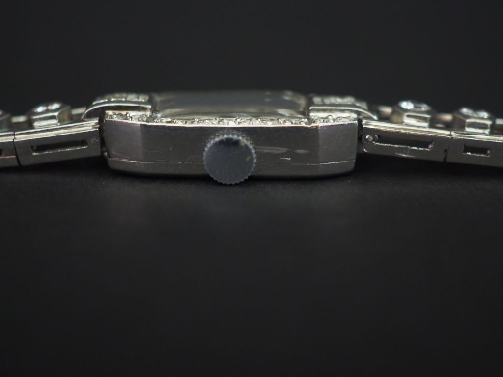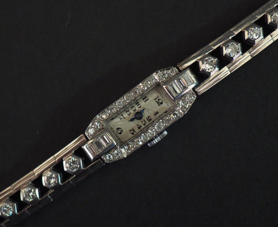 Montre de style Art déco en or blanc et diamants. Boitier à pans coupés sertis de diamants et diamants baguette. Bracelet articulé ajouré et serti de diamants disposés en chute. Cadran à chiffres arabes pour les heures. Long. 16,2 cm Poids tel. 29,20 g Vendue en l'état