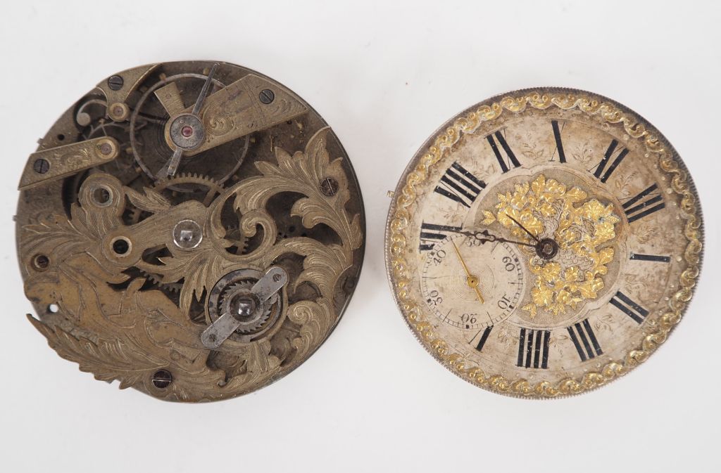 Mouvement de montre, comprenant un mécanisme et un cadran à chiffres romains pour les heures, compteur pour les secondes à 6h et agrémenté de fleurs dorées. Diam. 42 mm (incomplet) On y joint un mécanisme de montre de gousset, à décor de femme et rinceaux. Diam. 50 mm (incomplet)
