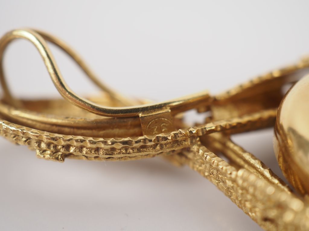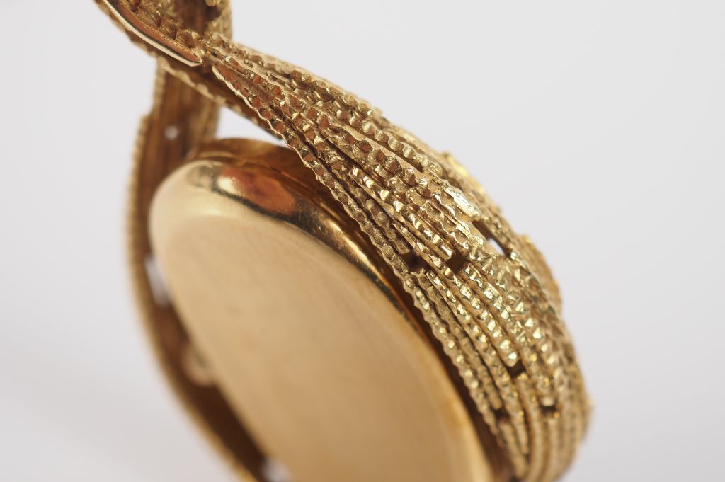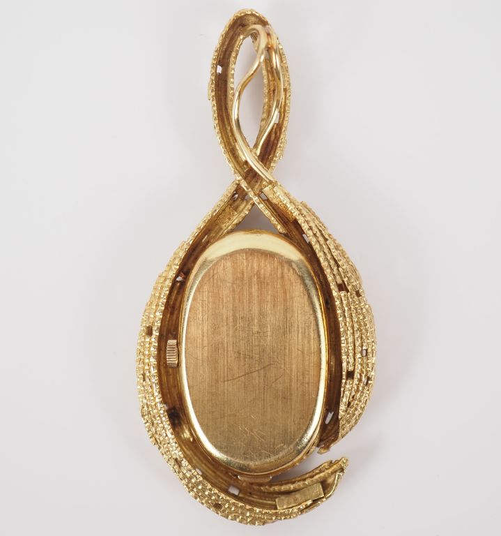 OMEGA / Andrew GRIMA Pendentif mouvementé en or jaune 750 en forme de goutte, agrémenté en son centre d'une montre ovale à verre facetté. Cadran à index bâtons sur fond champagne signé OMEGA. Mouvement mécanique. Le pendentif signé A. GRIMA et numéroté BB520. 8,5 x 3,5 cm Poids tel. 50,56 g