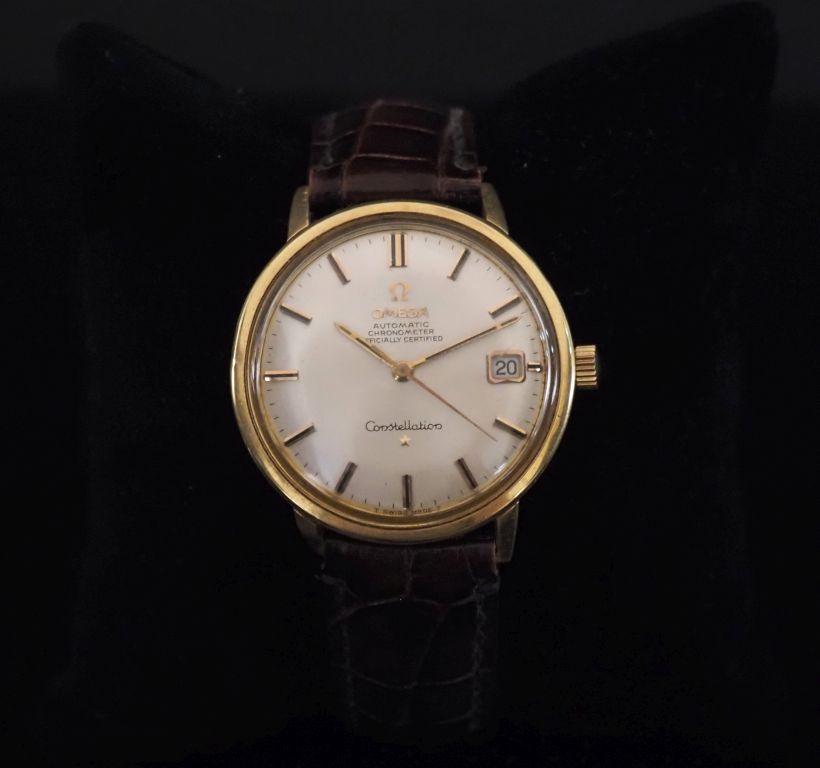 OMEGA, Constellation Montre bracelet chronomètre, boitier en or jaune 750. Cadran rond à index appliqués pour les heures. Guichet dateur à 3h. Bracelet cuir marron, boucle ardillon. Mouvement automatique. Signée. Diam. 36 mm Poids tel. 39 g (environ) (bracelet usé, couronne de remontoir légèrement tordue, rayures sur le verre)