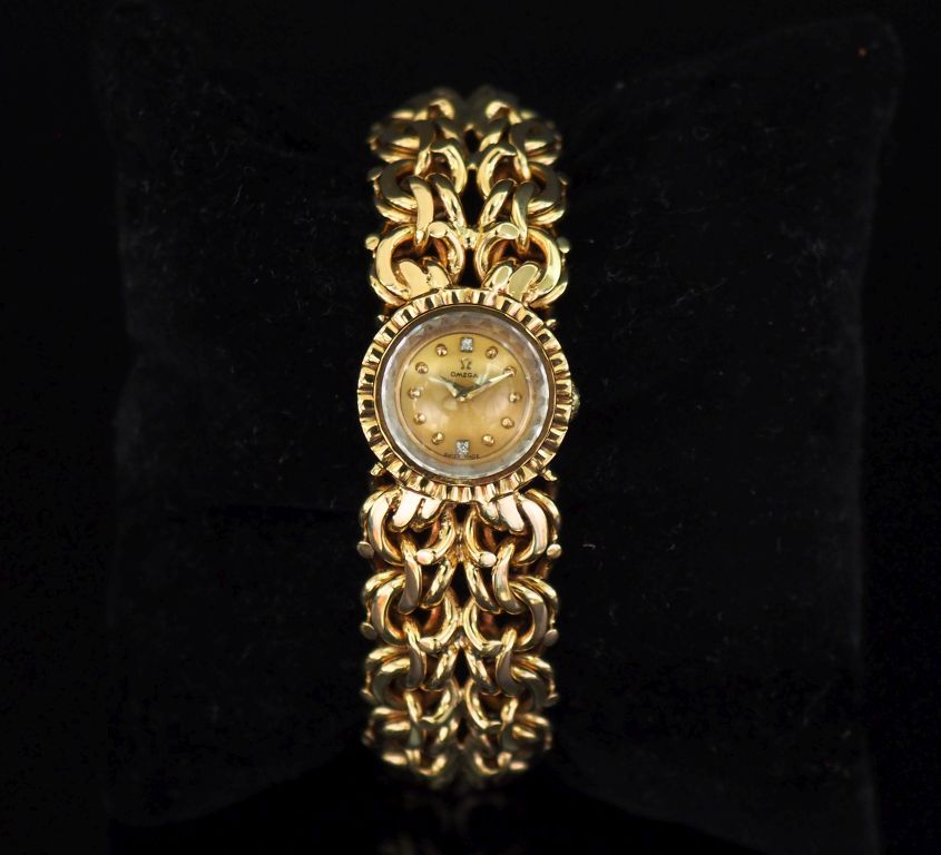 OMEGA, Montre bracelet de dame, boitier et bracelet en or jaune 750. Cadran rond à pastilles appliquées et deux diamants pour les heures. Bracelet souple, maille tressée ajourée. Chainette de séurité. Diam. 20 mm Larg. du bracelet : 2 cm Poids tel. 112,77 g