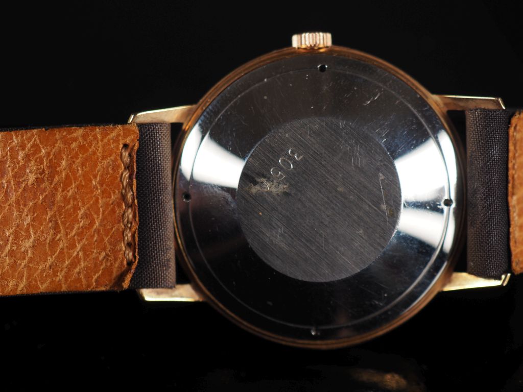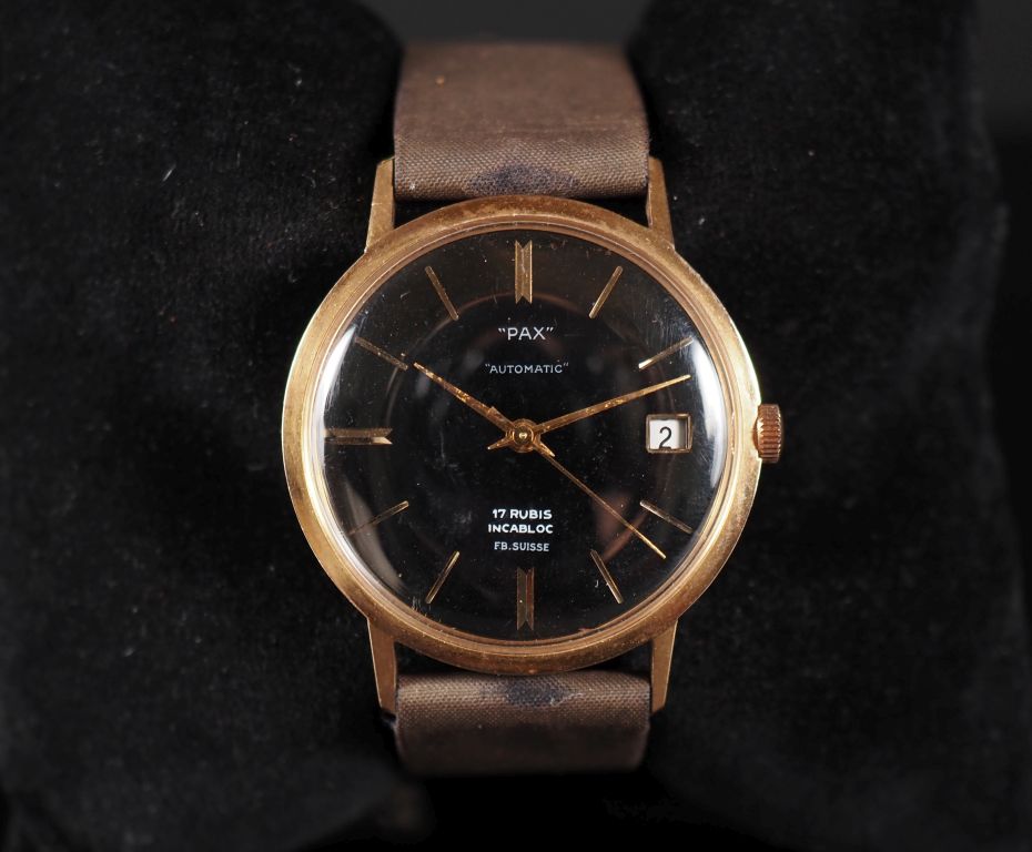 PAX, Automatic Montre bracelet en métal doré. Cadran à fond noir, index bâtons dorés pour les heures. Guichet dateur à 3h. Bracelet tissu noir (usé). Signée. Diam. 34 mm (usures) Vendue en l'état, sans garantie.