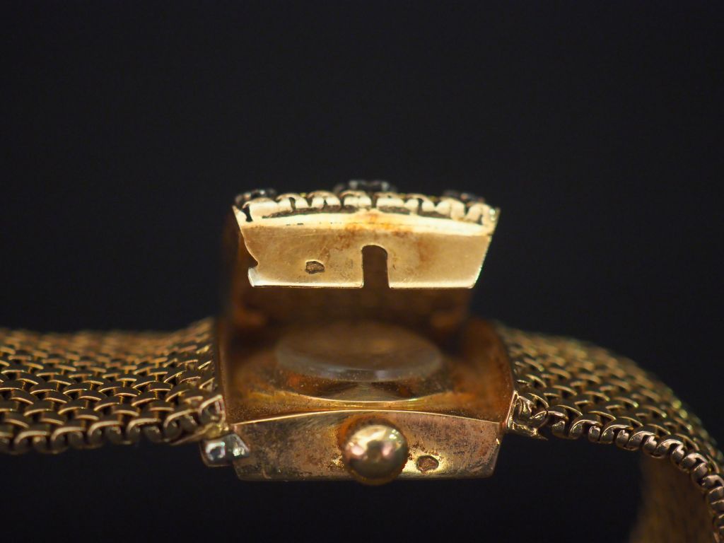 PAX Bracelet montre à secret en or jaune. Cadran rond à index bâtons et chiffres arabes pour les heures. Le cache, à décor d'étoiles serties de diamants. Bracelet articulé maille plate tressée. Chainette de sécurité. Larg. du bracelet : 2 cm Poids tel. 69,61 g Vendue en l'état