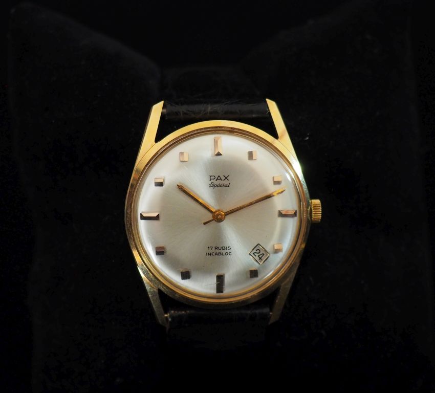 PAX, Spécial Montre bracelet, boitier en or jaune 750. Cadran à pastilles dorées pour les heures. Guichet dateur entre 4h et 5h. Bracelet cuir noir, boucle ardillon. Mouvement mécanique. Signée. Numérotée au revers 33747. Diam. 35 mm Poids tel. 30 g environ