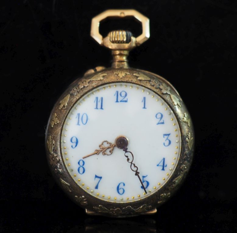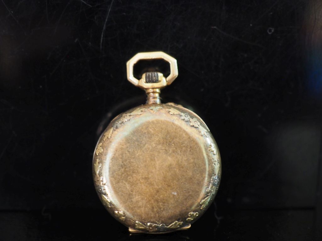 Petite montre de col Napoléon III de style Louis XVI en or jaune 750. Cadran à chiffres arabes pour les heures. Le pourtour, à décor de frises de fleurettes. Double fonds en or jaune 750. Diam. 27 mm Poids tel. 16,16 g