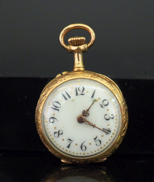 Petite montre de col Napoléon III de style Louis XVI en or jaune 750. Cadran rond à chiffres arabes pour les heures. Le revers, à décor polychrome d'une jeune élégante aux arrosoirs. Le pourtour, à décor de rinceaux. Double fonds en or jaune 750. Diam. 25 mm Poids tel. 12,87 g