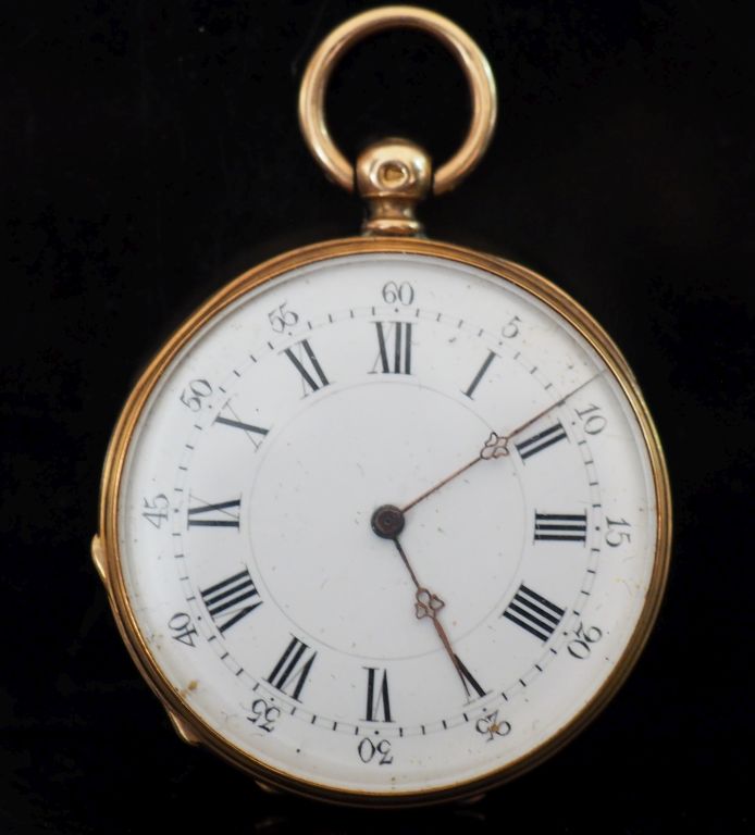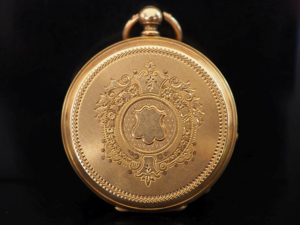Petite montre de gousset Napoléon III en or jaune 750. Cadran à chiffres romains pour les heures, arabes pour les minutes et chemin de fer. Le revers, à décor de cartouche, fleurs et rinceaux. Double fonds en cuivre. Diam. 38 mm Poids tel. 39,78 g (petites usures)