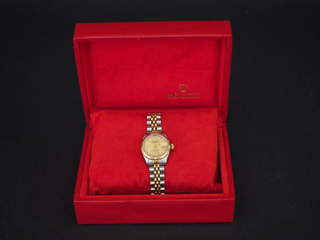 ROLEX, Oyster Perpetual Date Just. Ref. 69173 No. E705919 Montre bracelet de dame en acier et or jaune 18k (750). Boîtier rond, couronne et fond vissé. Fond de boîtier porte numéro 69000A. Cadran doré avec index sertis de diamants pour les heures, trotteuse centrale et date à guichet. Mouvement automatique calibre 2135. Bracelet Jubilee en acier et or jaune 18k (750) avec fermoir déployant signé. Ecrin de la maison Rolex. Diam. 26 mm Poids brut. 56,3 g Vendue en l’état, traces d’usures d’usage, mouvement fonctionne mais prévoir révision d’usage, sans garantie. Expert : Geoffroy Ader - Ader watches