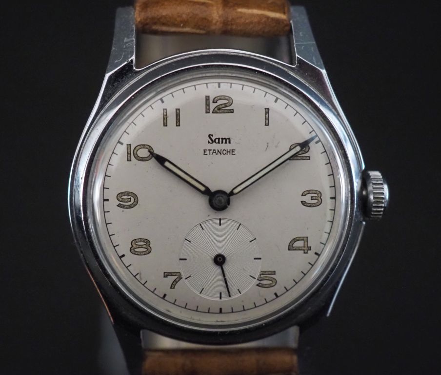 SAM, Etanche Montre bracelet en acier. Cadran rond à chiffres arabes pour les heures. Compteur pour les secondes à 6h. Aiguilles luminescentes. Mouvement mécanique à remontage manuel. Bracelet cuir marron. Signée. Diam. 33 mm