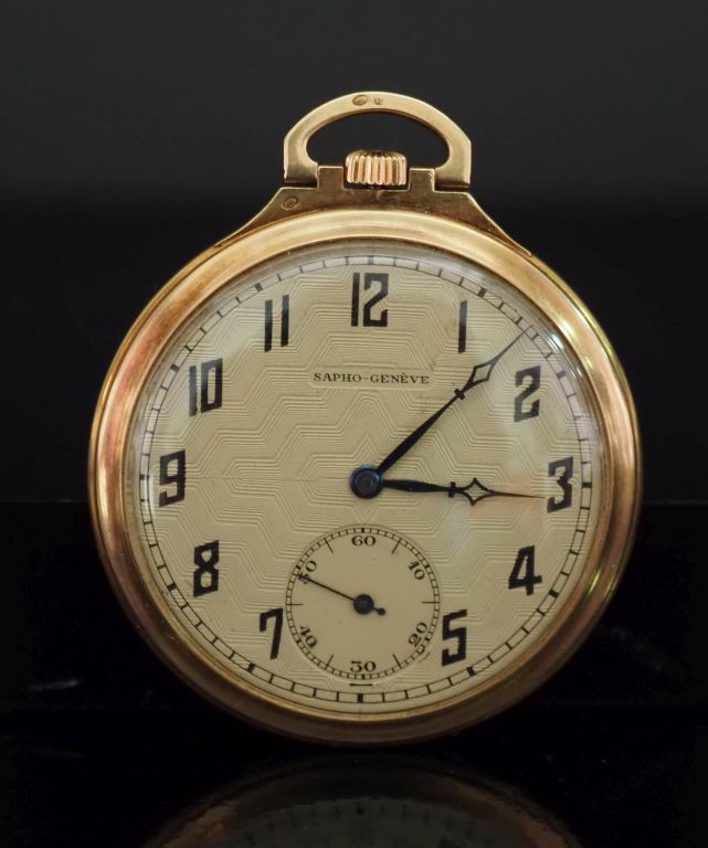 SAPHO, Genève Montre de gousset en or jaune 750. Cadran à chiffres arabes pour les heures. Compteur pour les secondes à 6h. Le revers, à décor de motifs géométriques. 48 mm Poids tel. 49,36 g