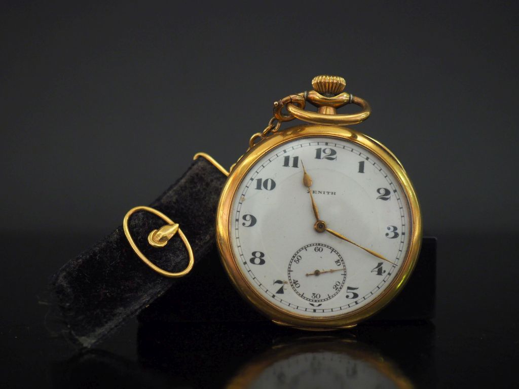 ZENITH Montre de gousset en or jaune. Cadran à chiffres arabes pour les heures. Compteurs pour les secondes à six heures. Double fonds en or jaune. Signée. Avec un élément de giletière en or jaune et velours noir. Diam. 46 mm Poids tel. (sans la giletière) : 72,45 g Poids tel. (avec la giletière) : 75,04 g