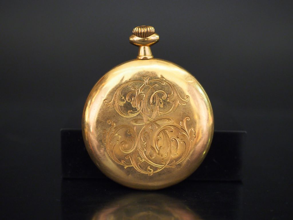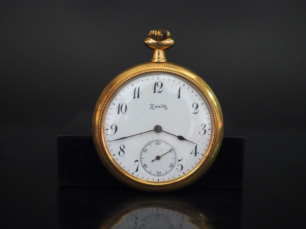 ZENITH Montre de gousset en or jaune. Cadran à chiffres arabes pour les heures. Compteur pour les secondes à 6h. Le revers à décor de monogramme feuillagé. Signée. Diam. 49 mm Poids tel. 78 g