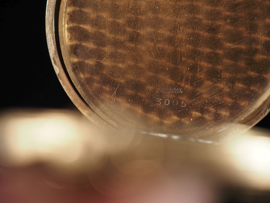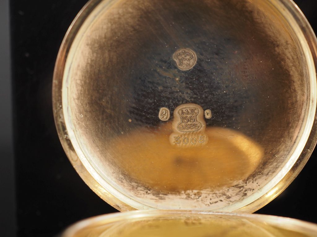 ZENITH (?) Montre de poche chronographe aveugle en or jaune 585. Cadran à chiffres arabes pour les heures. Compteur pour les secondes à 6h. L'avant et le revers, à décor d'un écusson et de bandes géométriques. Double fonds en métal doré. Signée sur le cadran. Diam. 51 mm Poids tel. 76,09 g (plastique protégeant le cadran à refixer ainsi que la lunette, marque en partie effacée sur le cadran, usures) Vendue en l'état, sans garantie.