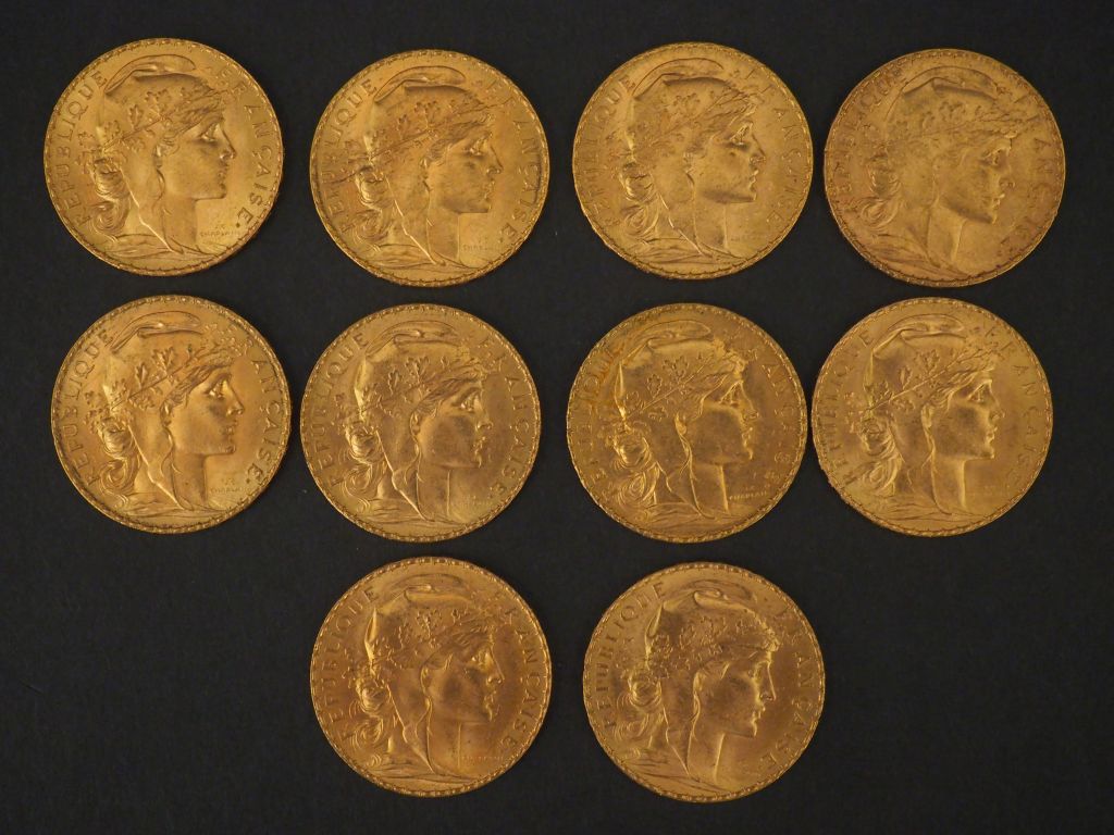 Lot de 10 pièces de 20 Francs or, 1908 FRAIS ACHETEUR : 10 % HT au prix de à € en vente aux enchères par l'hôtel des ventes Primardeco
