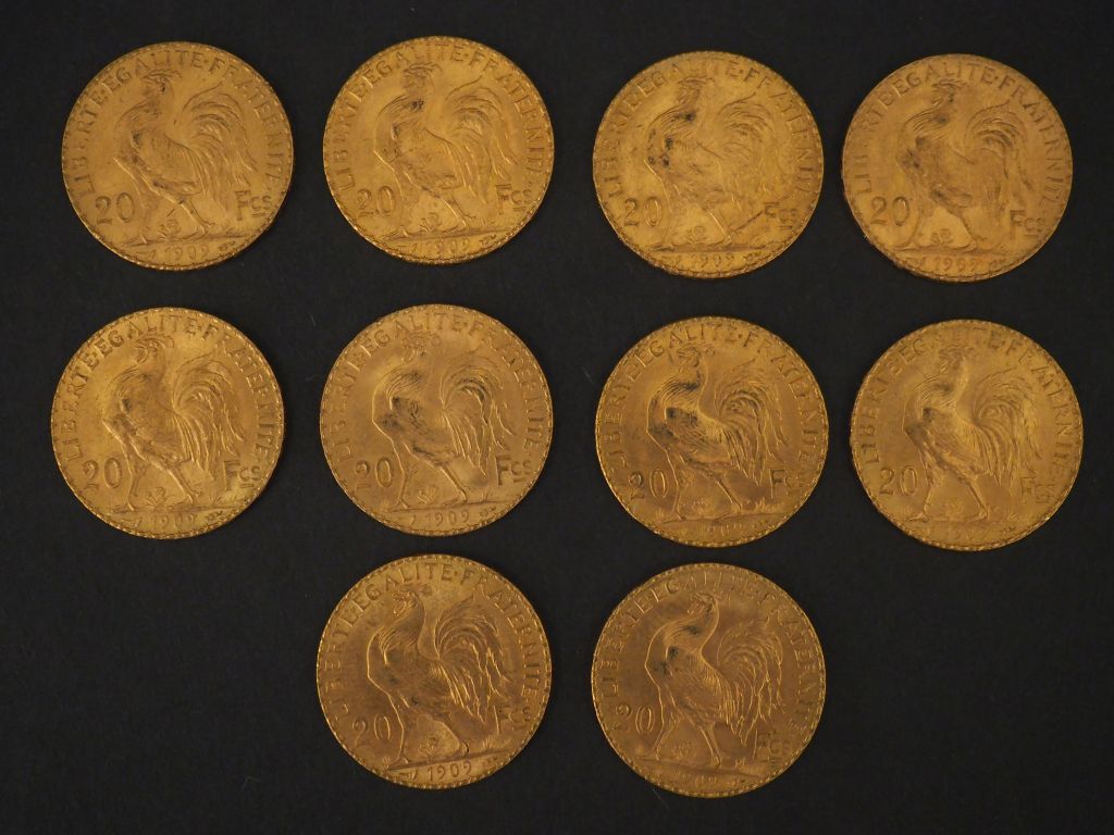 10 pièces de 20 Francs or, 1909 FRAIS ACHETEUR : 10 % HT