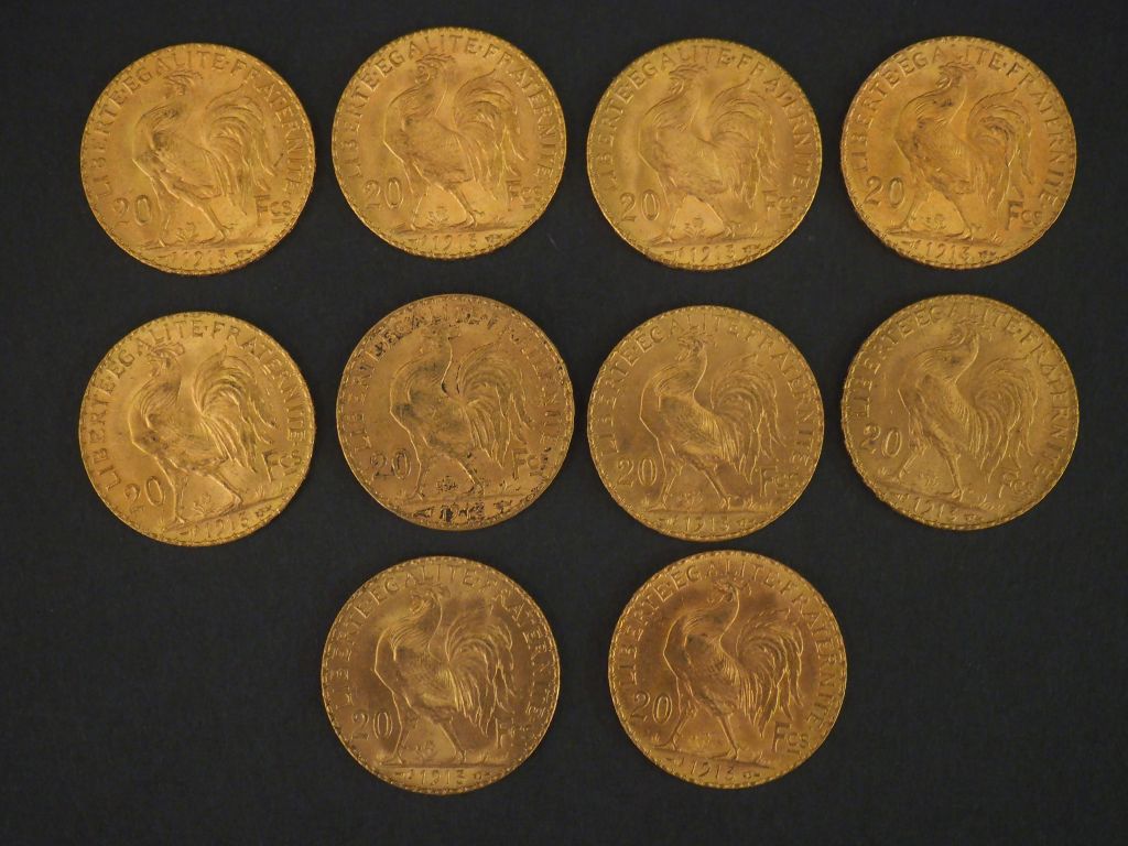 10 pièces de 20 Francs or, 1913 FRAIS ACHETEUR : 10 % HT