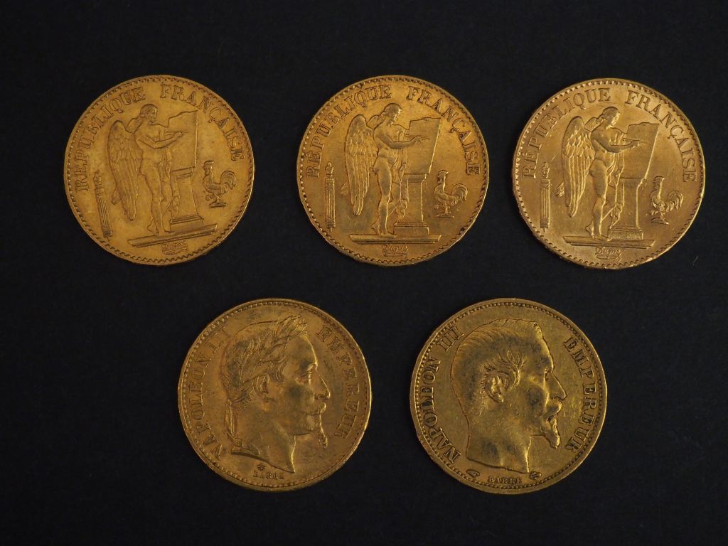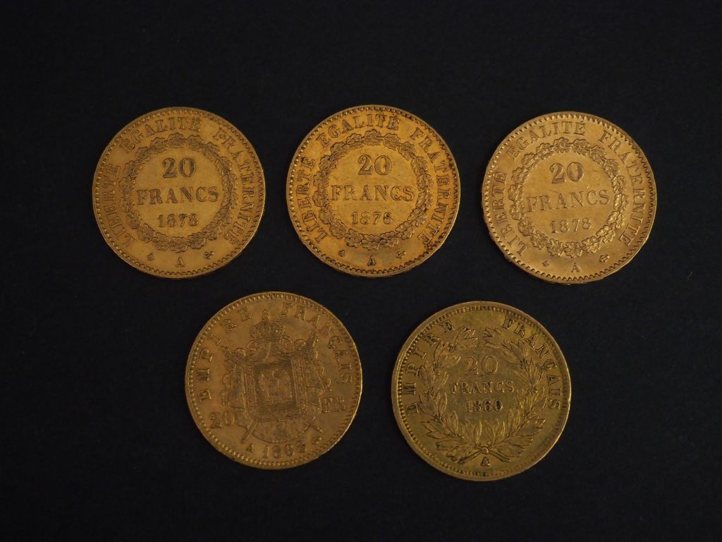 Cinq pièces de 20 Francs or, 1860-A, 1868-A et 1878-A (x3). FRAIS ACHETEURS 5% TTC.