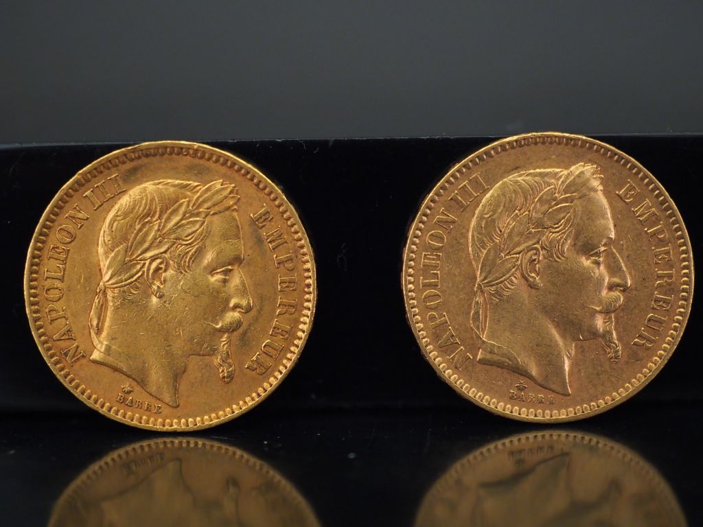Deux pièces de 20 Francs or, 1862-A et 1863-A. FRAIS ACHETEURS 5% TTC.