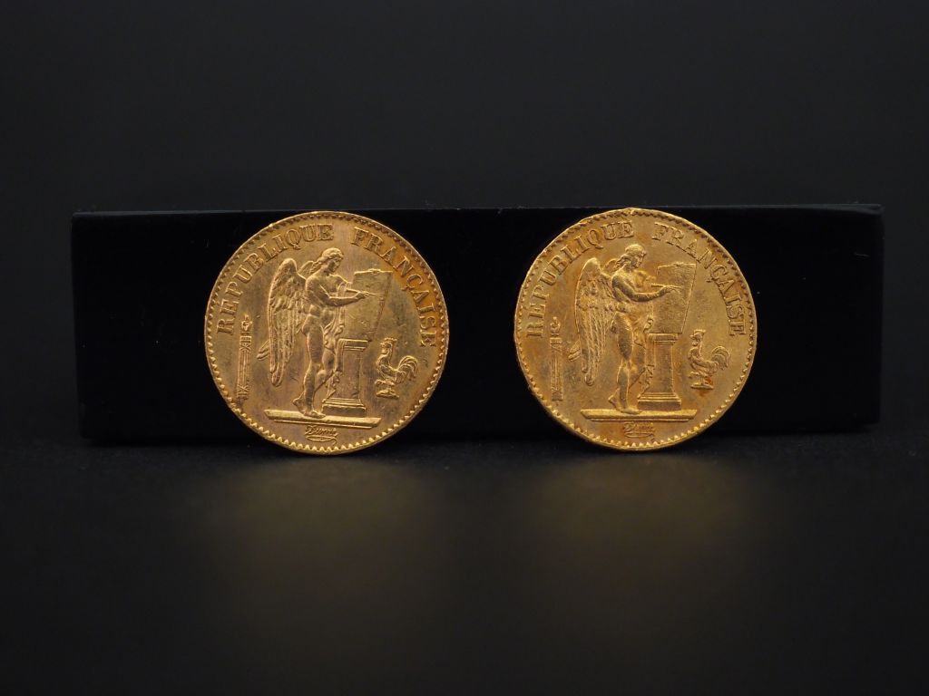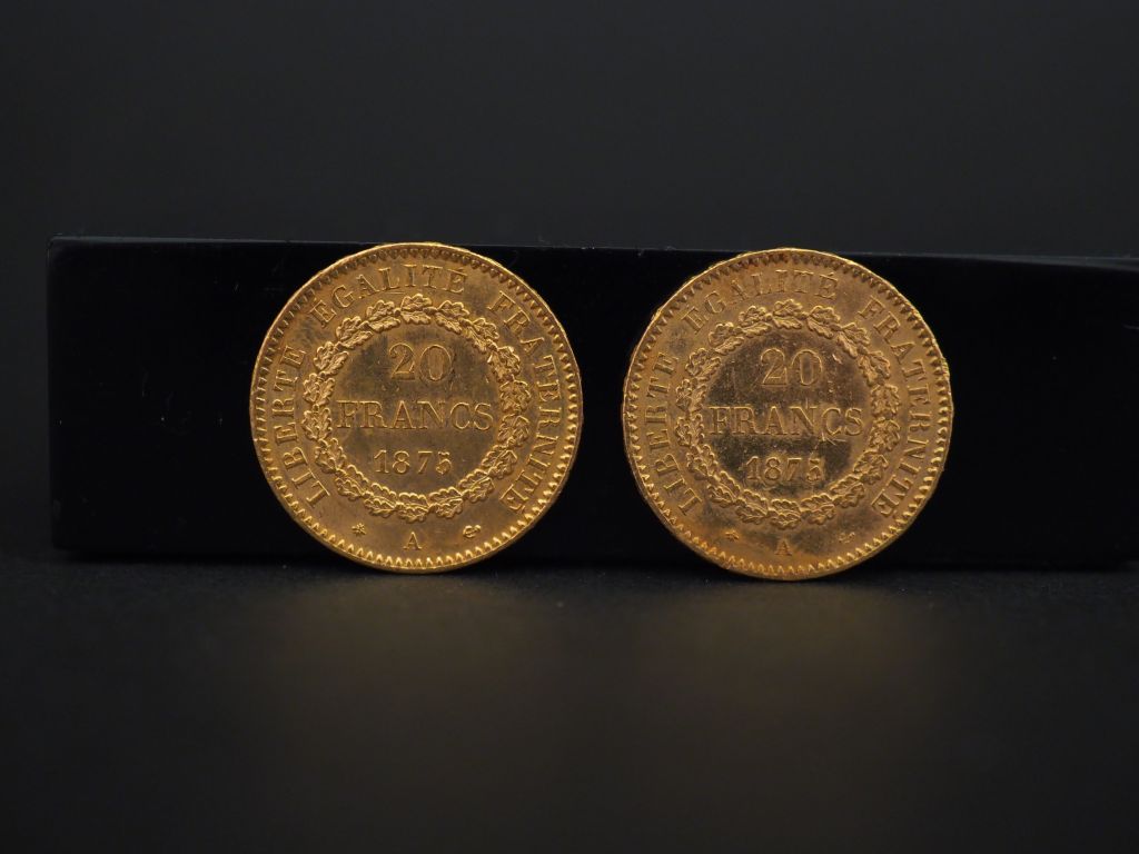 Deux pièces de 20 francs or, 1875-A. FRAIS ACHETEURS 5% TTC.