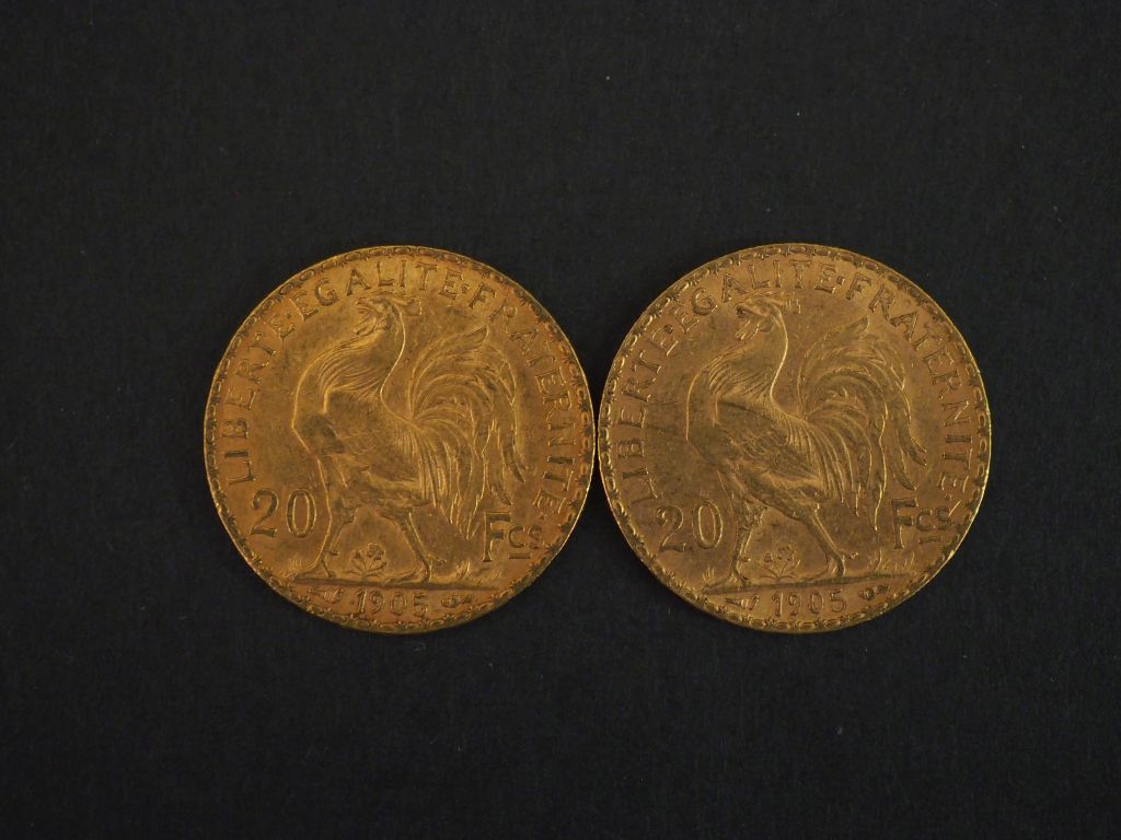 Deux pièces de 20 Francs or, 1905. FRAIS ACHETEURS 10% HT.