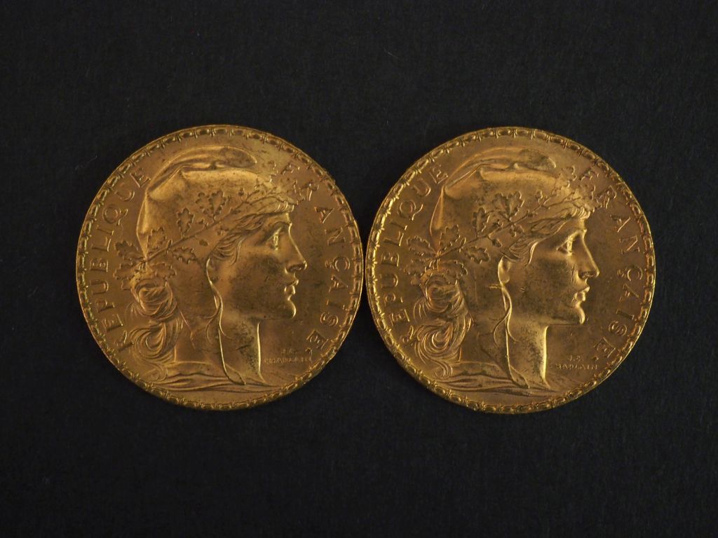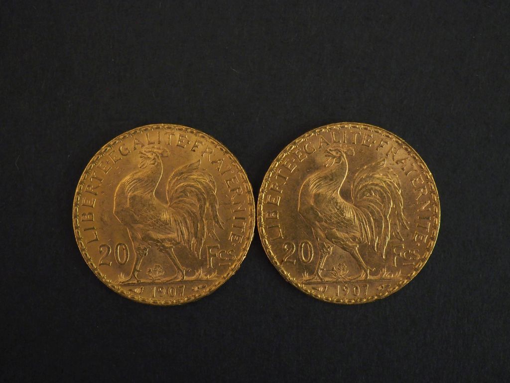 Deux pièces de 20 Francs or, 1907. FRAIS ACHETEURS 10% HT.
