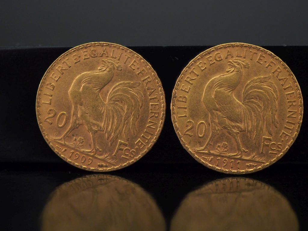 Deux pièces de 20 Francs or, 1909 et 1911.