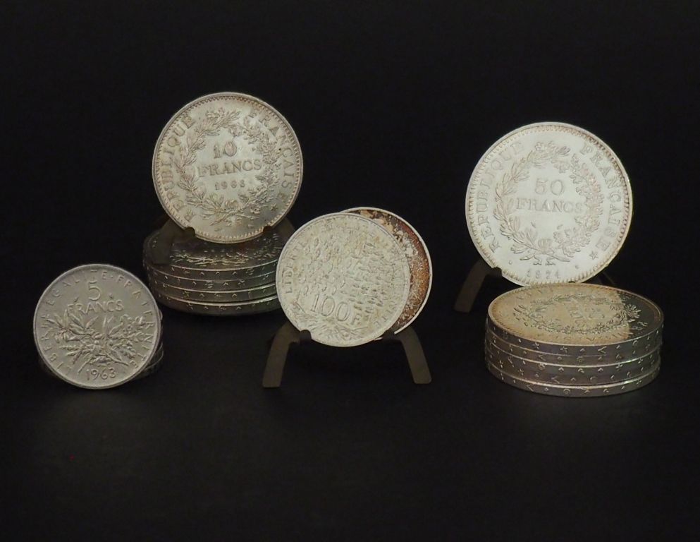Ensemble comprenant : - deux pièces de 100 Francs argent, 1982 et 1987. - six pièces de 50 Francs argent, 1974 (x5) et 1977. - six pièces de 10 Francs argent, 1965 (x3), 1966 (x2) et 1967. - six pièces de 5 Francs argent, 1962 (x3), 1963 et 1964 (x2). Poids. 430 g