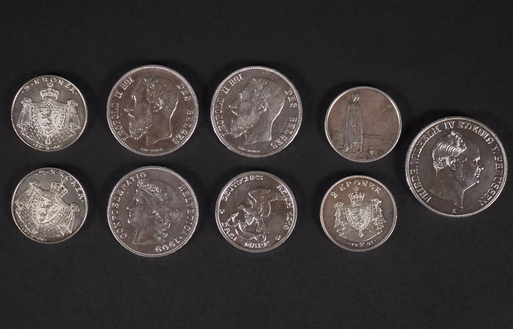 Ensemble comprenant : - deux pièces de 5 Francs belge en argent, 1868 et 1873. - une pièce de 5 Francs suisse en argent, 1909. - une pièce de 3 1/2 Gulden en argent, 1856. - une pièce de drei mark en argent, 1913. - quatre pièces de 3 Kroner en argent, 1905 (x3) et 1914. Poids. 188,71 g