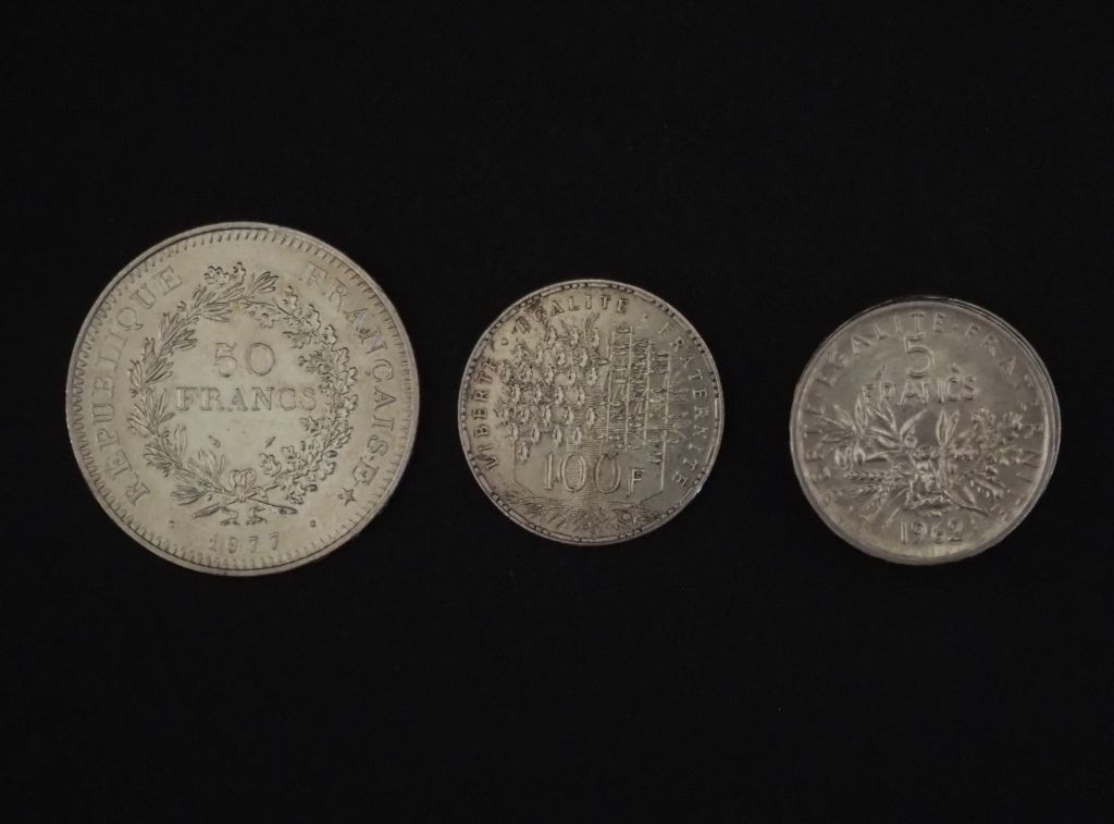 Ensemble comprenant : - une pièce de 100 Francs en argent, 1983 - une pièce de 50 Francs en argent, 1977 - huit pièces de 5 Francs en argent Poids. 141 g