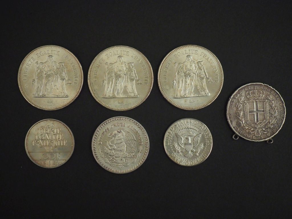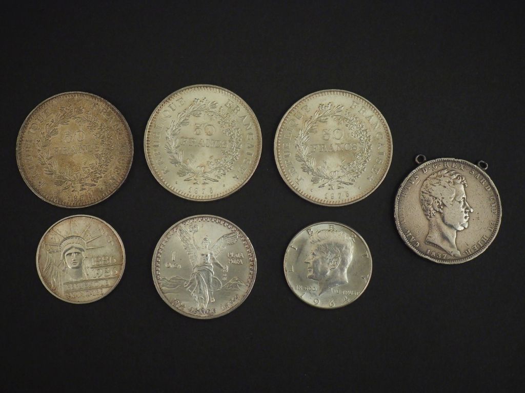 Ensemble comprenant : - une pièce de 100 Francs en argent, 1986. - trois pièces de 50 Francs en argent, 1975. - une pièce de un Onza en argent. - une pièce d'1/2 Dollars en argent, 1964. - une pièce de 5 Lire en argent, 1837. Poids. 173,88 g -