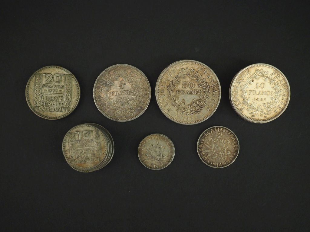 Ensemble comprenant : - une pièce de 100 Francs en argent - trois pièces de 50 Francs en argent - deux pièces de 20 Francs en argent - treize pièces de 10 Francs en argent - une pièce de 5 Francs en argent - une pièce de 2 Francs en argent - deux pièces de 1 Franc en argent Poids. 376,95 g -vb -
