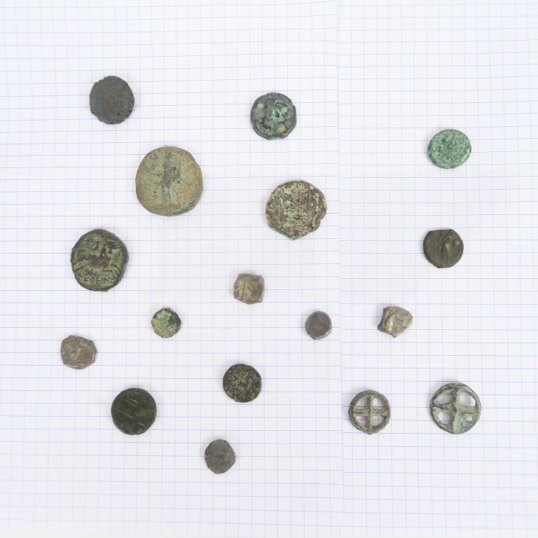 Lot de quinze monnaies antiques, dont celtibères et gauloises, et deux rouelles. B-TB.