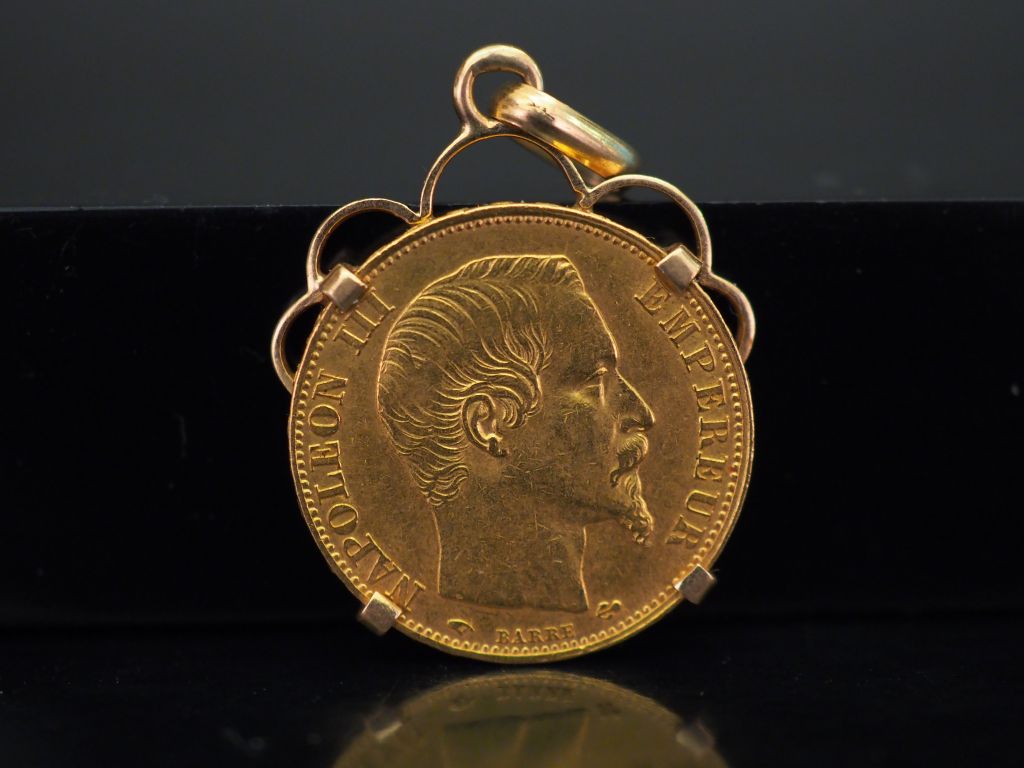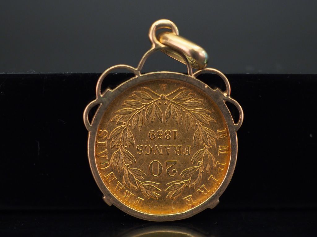 Pendentif en or jaune, serti en son centre d'une pièce de 20 Francs or, 1859-A. Poids. 8,30 g