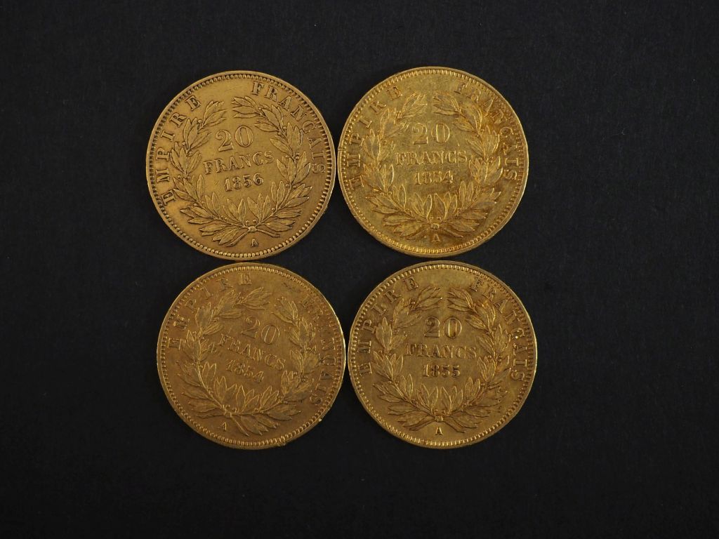 Quatre pièces de 20 Francs or, 1854-A (x2), 1855-A et 1856-A. FRAIS ACHETEURS 10% HT.