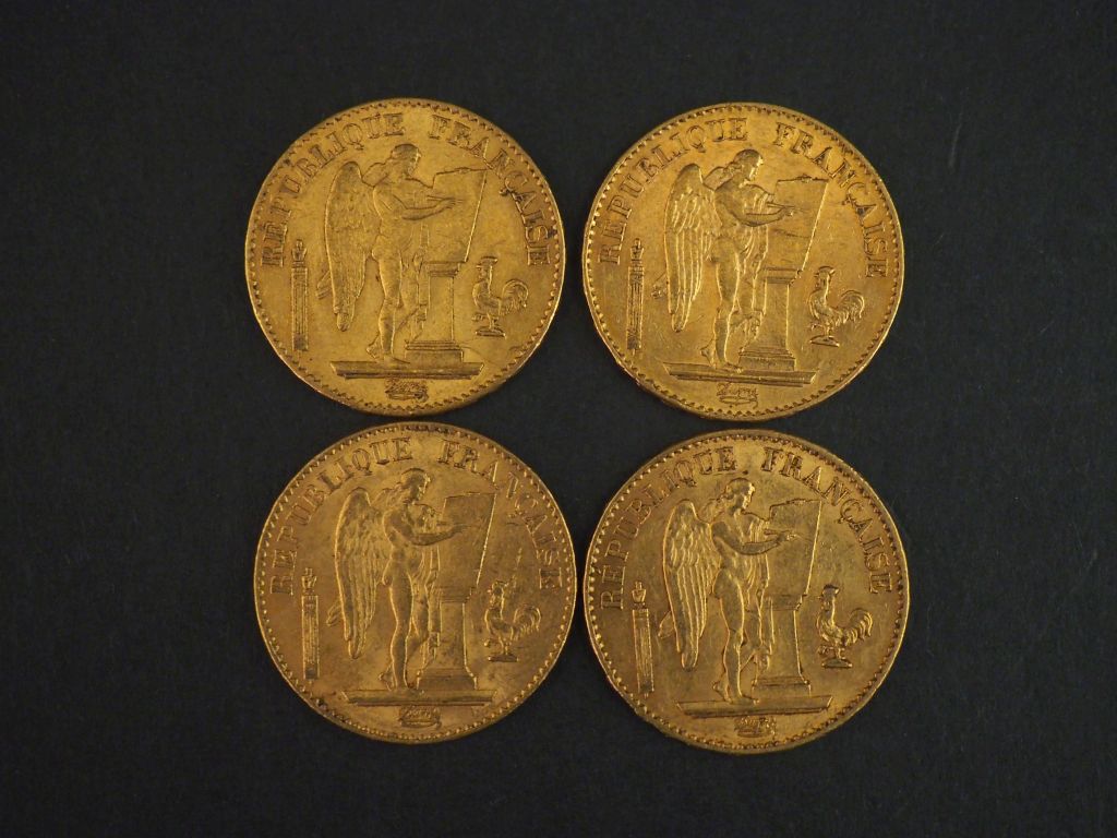 Quatre pièces de 20 Francs or, 1875-A (x1), 1876-A (x1) et 1878-A (x2). FRAIS ACHETEURS 10% HT.