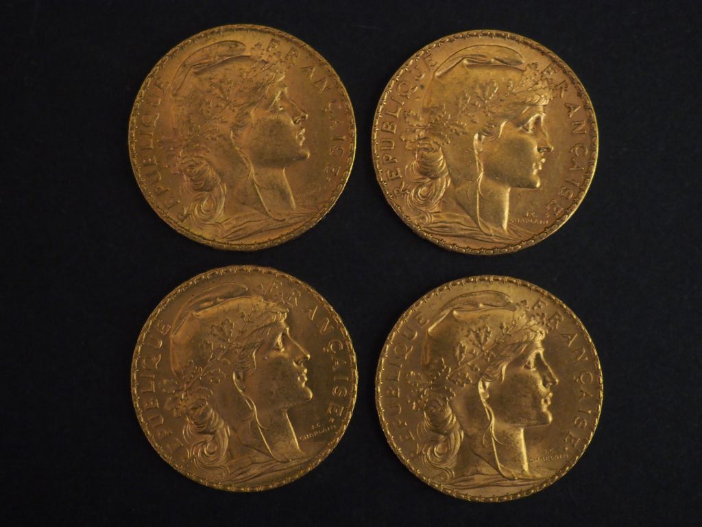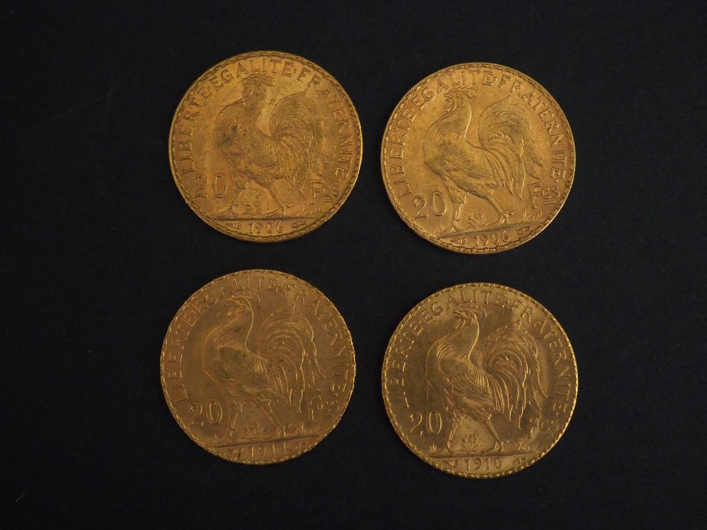 Quatre pièces de 20 Francs or, 1906 (x2), 1910 et 1911. FRAIS ACHETEURS 5% TTC.