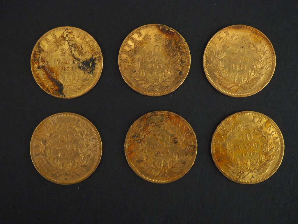 Six pièces de 20 francs or, 1858-A. FRAIS ACHETEURS 5% TTC.