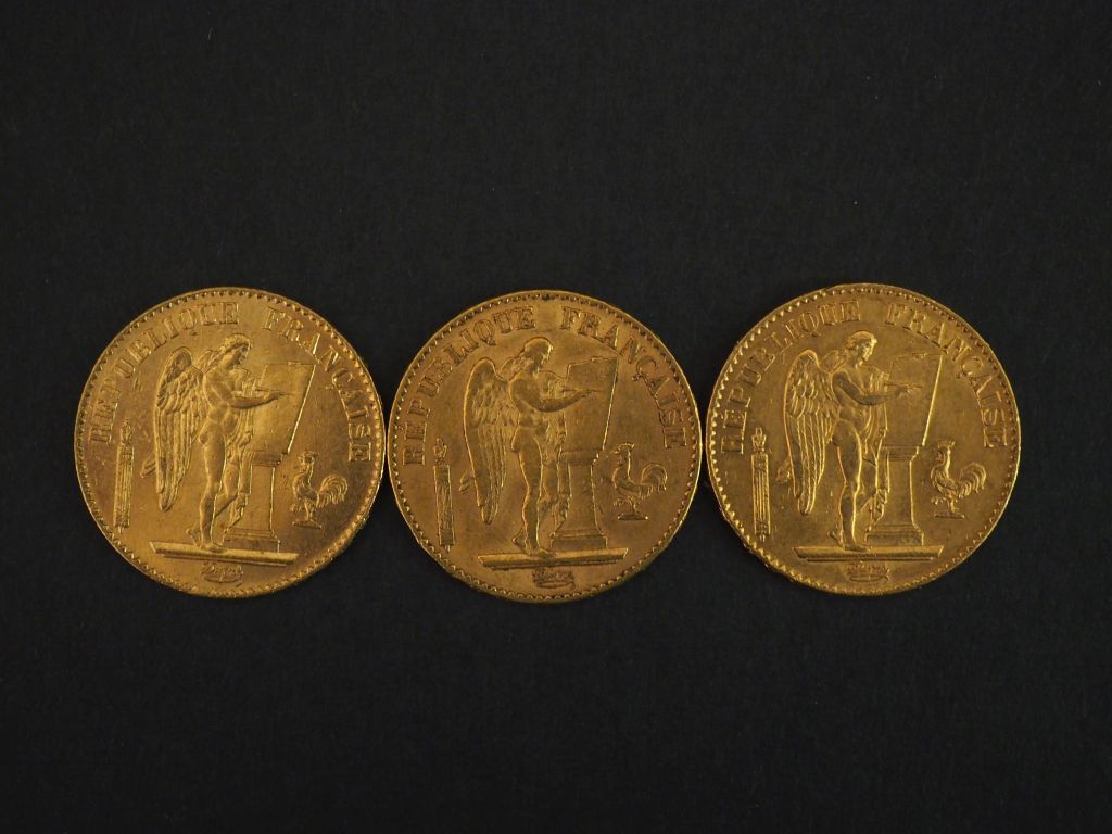 Trois pièces de 20 Francs or, 1875-A (x2) et 1877-A. FRAIS ACHETEURS 10% HT.